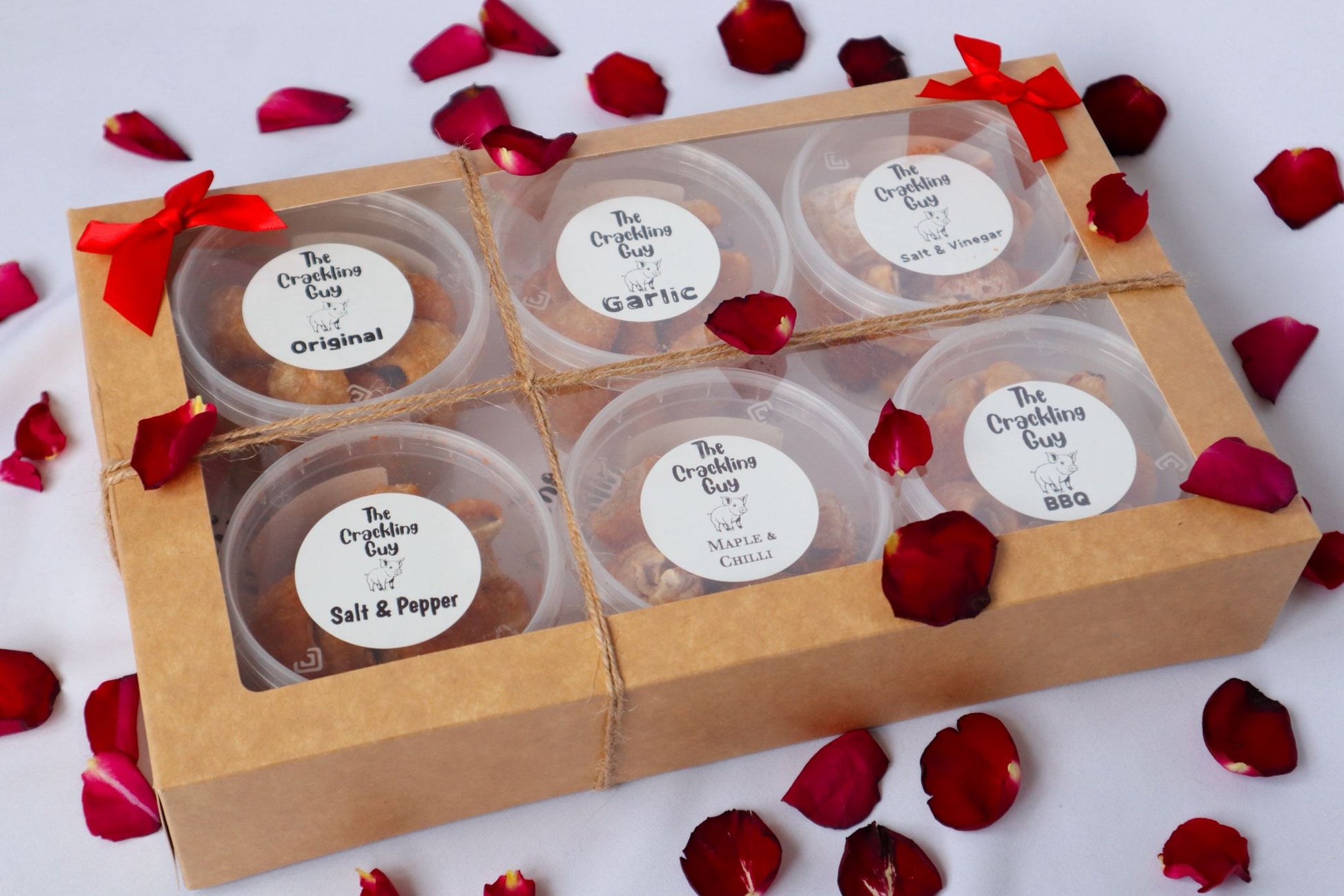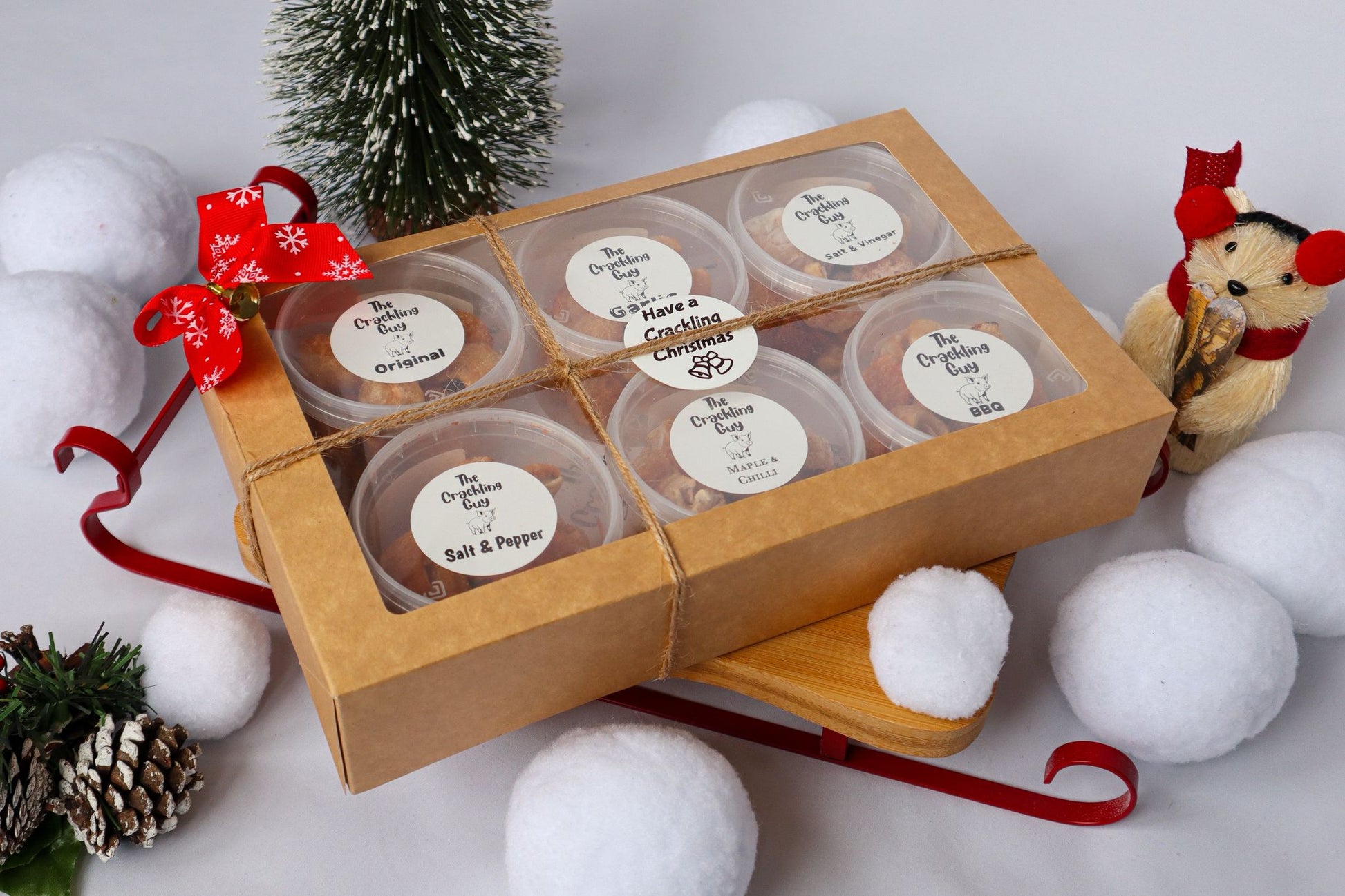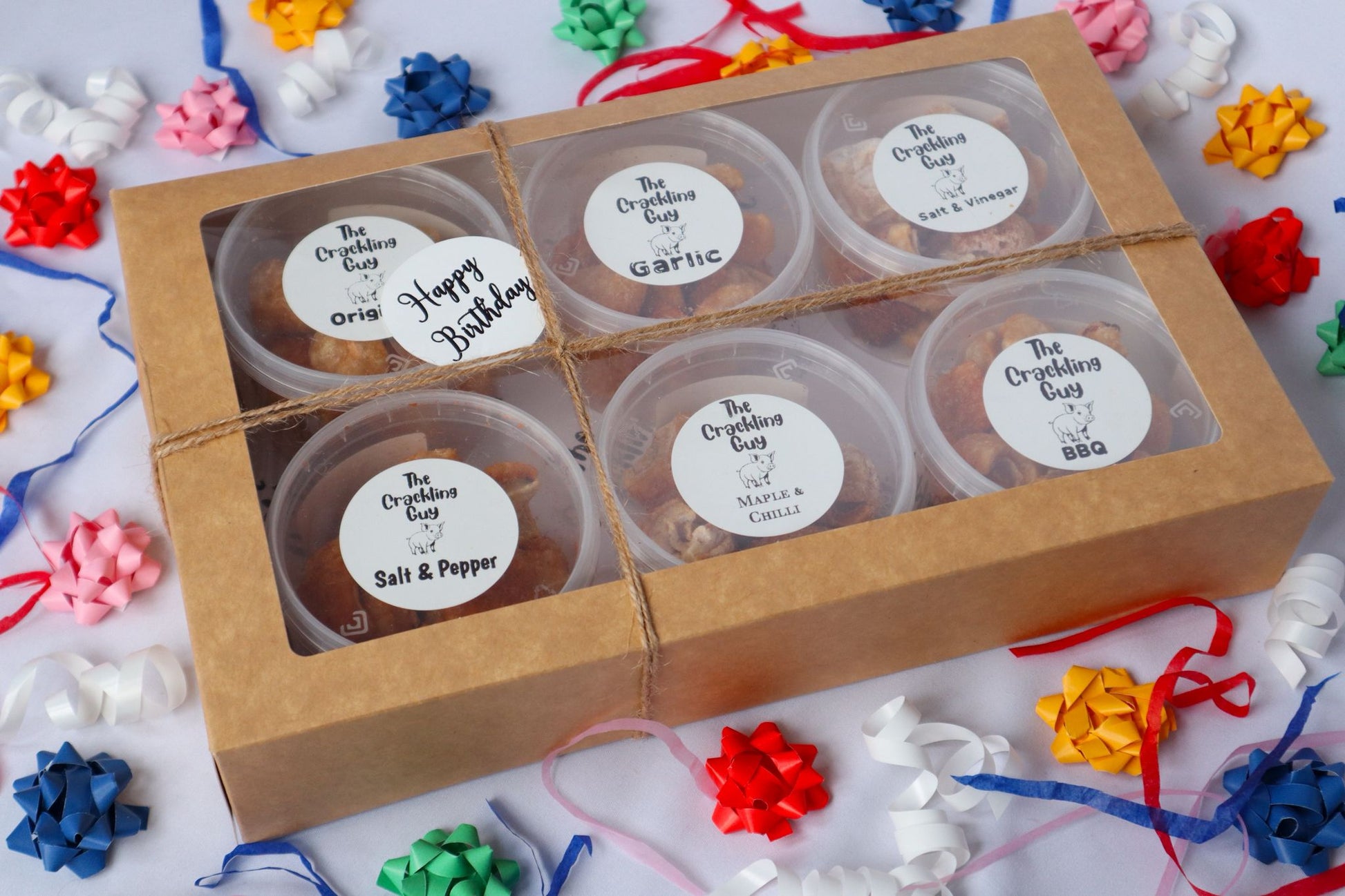 Beautifully created boxes, containing 6 tubs of perfectly flavoured crackling.