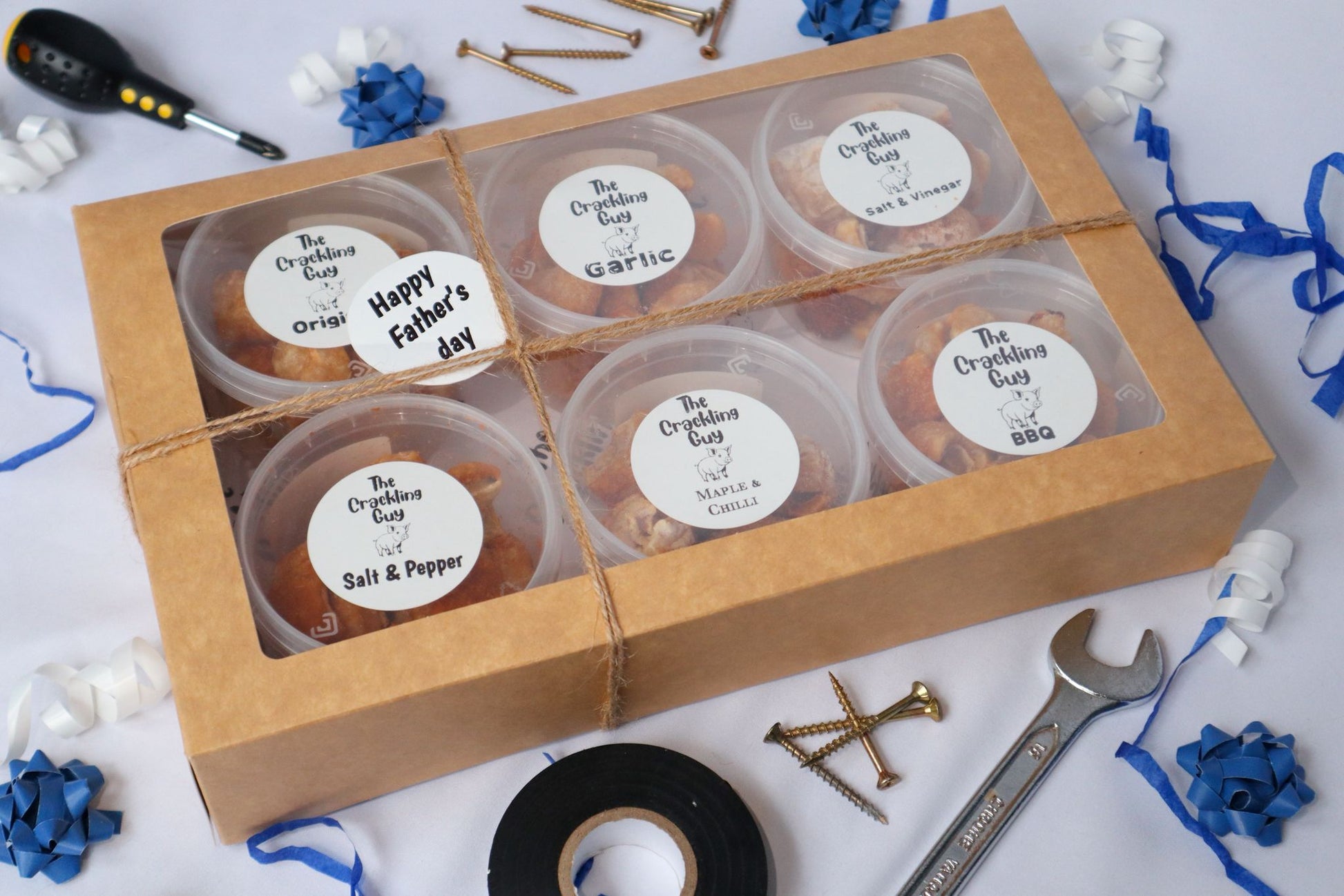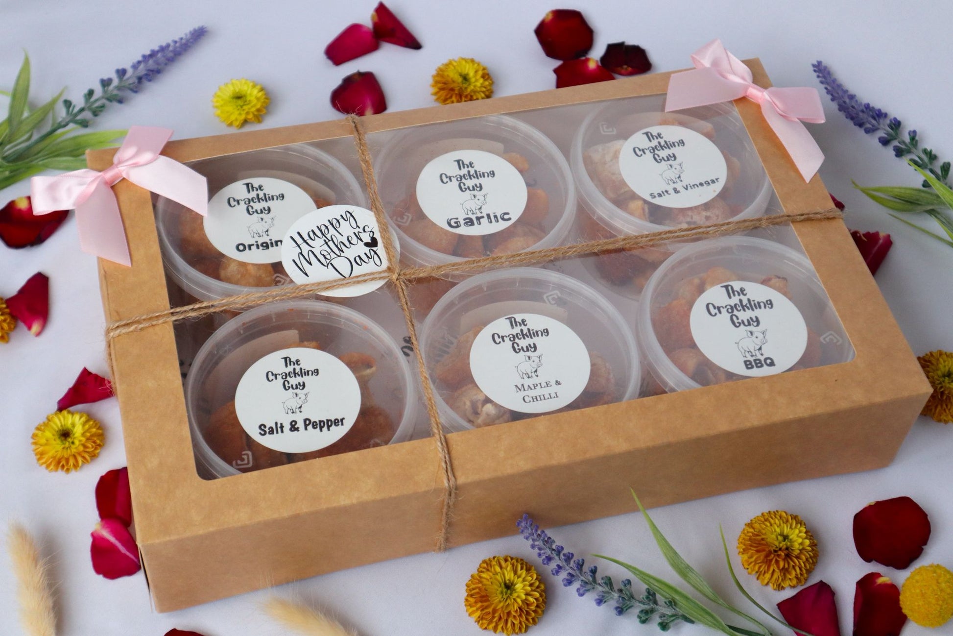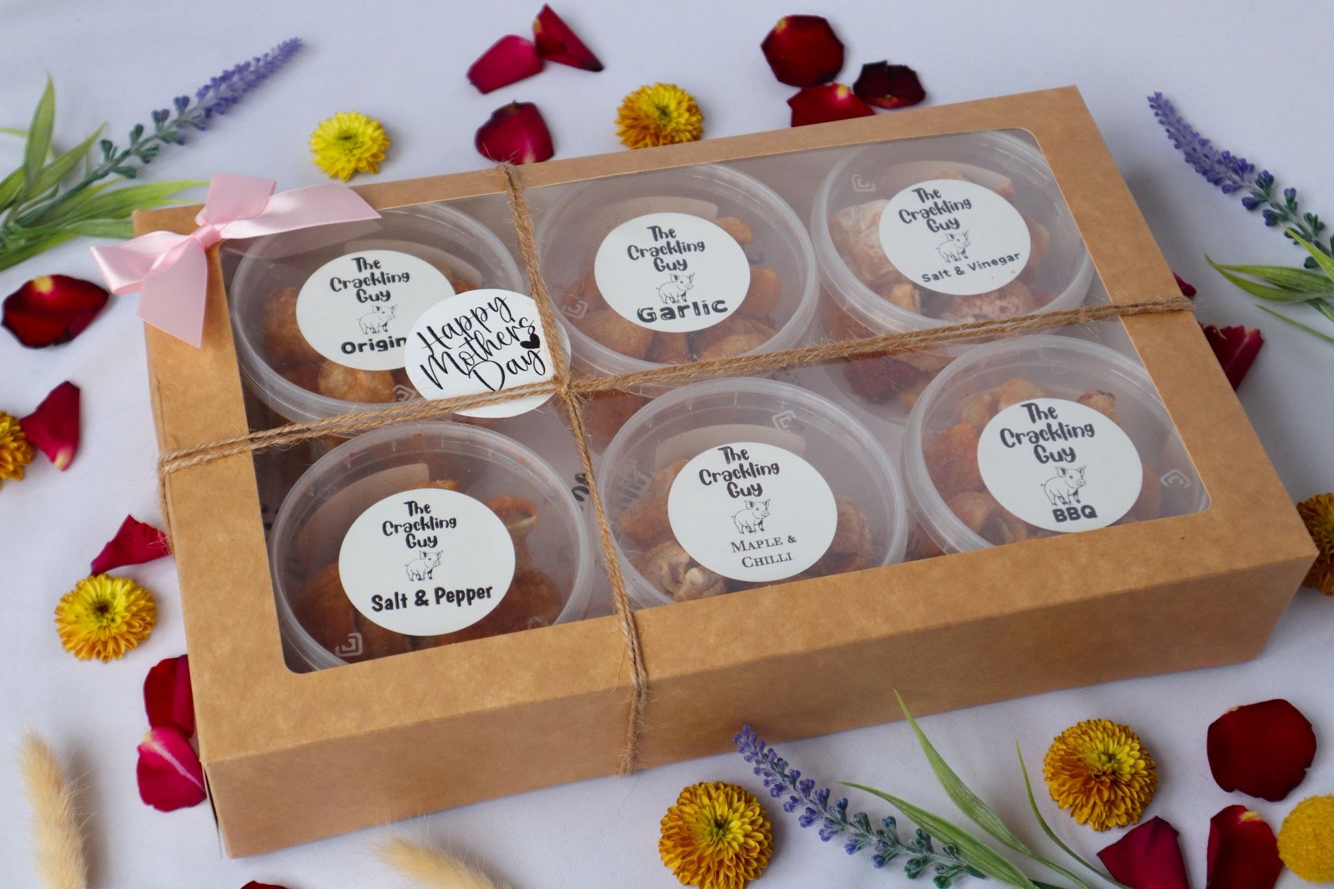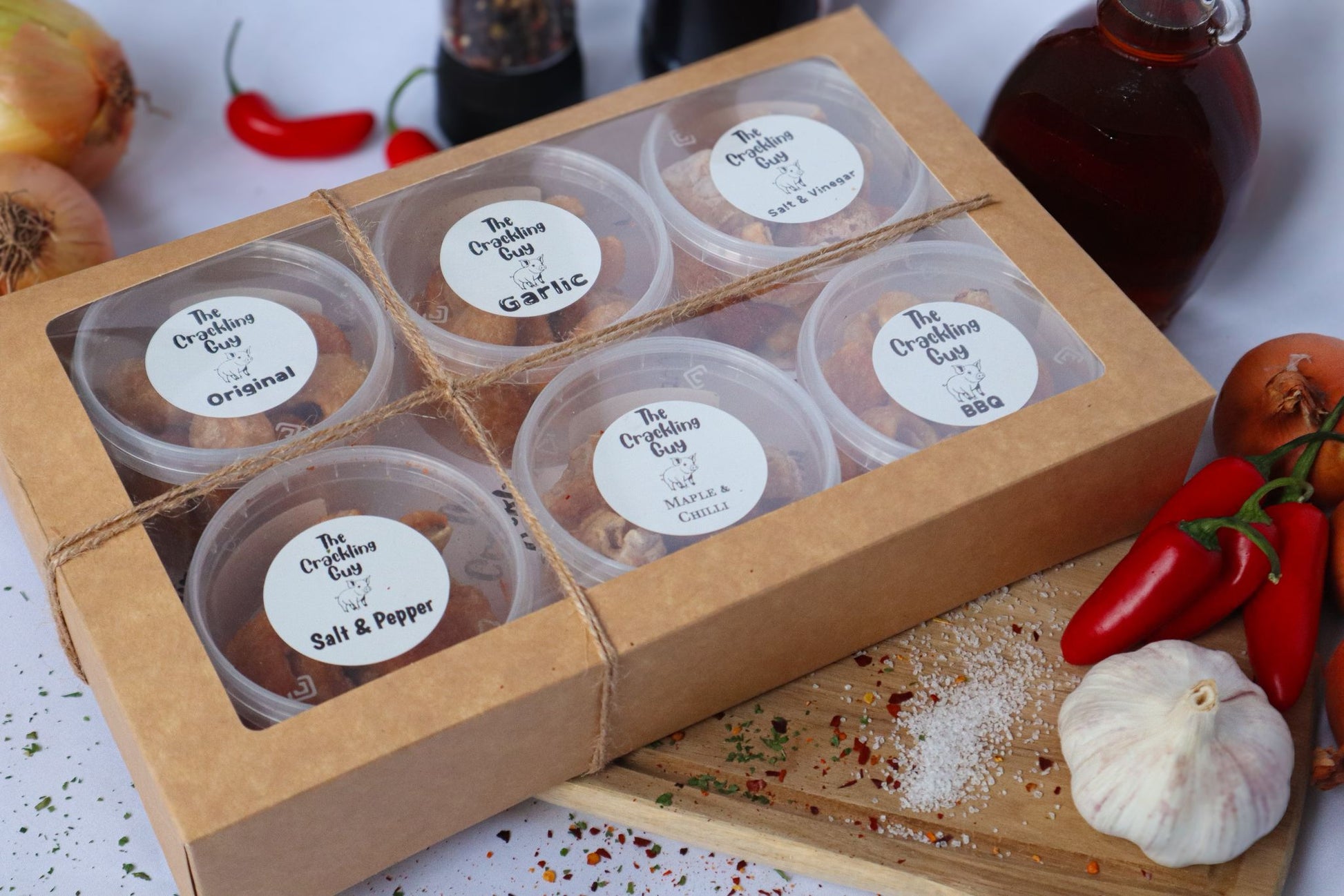 Beautifully created boxes, containing 6 tubs of perfectly flavoured crackling.